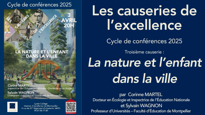 Par admin francoise-combes2, publié le vendredi 12 décembre 2025 13:50 - Mis à jour le vendredi 12 décembre 2025 13:50Jeudi 3 avril 20h - "La nature et l'enfant dans la ville" par Madame MARTEL Corinne - Docteur en Écologie et Inspectrice de l’Éducation Nationale, Monsieur WAGNON Sylvain - Professeur d’Universités – Faculté d’Éducation de Montpellier -