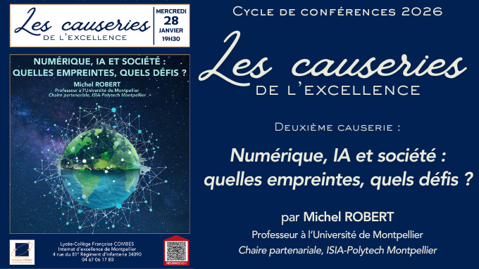 Par admin francoise-combes2, publié le samedi 13 décembre 2025 15:17 - Mis à jour le samedi 13 décembre 2025 19:26Mercredi 28 janvier 19h30 Numérique, IA et société : quelles empreintes, quels défis ? Par Michel ROBERT, Professeur à l’Université de Montpellier, Chaire partenariale, ISIA-Polytech Montpellier -