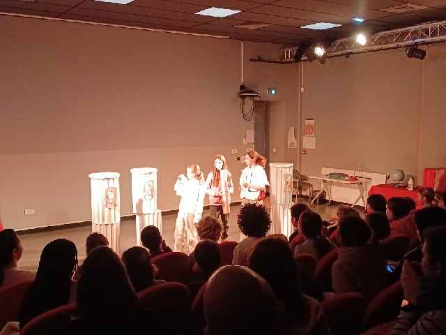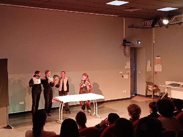 Dans le cadre du projet Voyage au cœur de la mythologie, les élèves de sixième ont participé à des ateliers théâtre avec la Compagnie Septième Point. En petits groupes de 3 à 4 élèves, ils ont créé un court spectacle mettant en scène un héros ou une héroïne de leur choix, inspiré de la pièce Les Fabulations Domestiques – opus 3 Le Mythe d'Artémis et de leurs apprentissages en histoire, français, sciences et autres disciplines ayant établi des liens avec la mythologie.