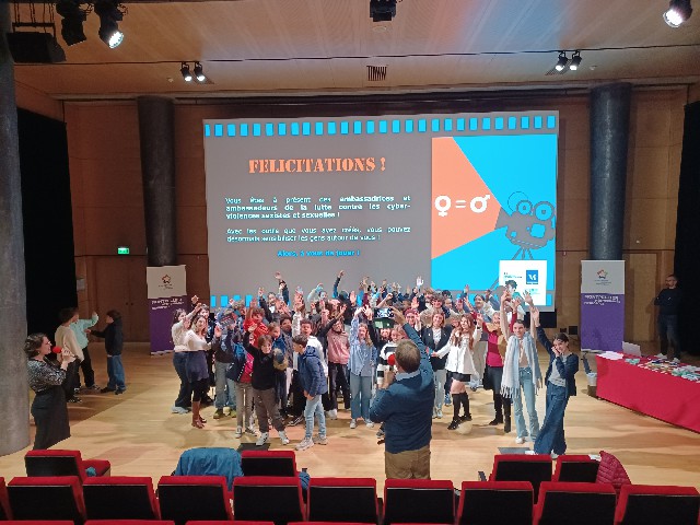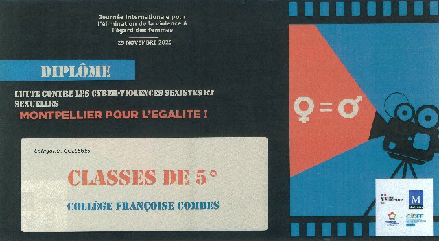 Mardi 25 novembre 2025, les élèves de cinquième du Lycée Collège Françoise Combes se sont rendus à la médiathèque Émile Zola pour la journée de lutte contre les violences faites aux femmes organisée par la ville de Montpellier. Ils ont pu présenter leur podcast sur les cyberviolences sexistes et sexuelles et écouter les productions d'autres collégiens. Ils ont également participé à une animation du Centre d’information pour les droits des femmes et des familles de l’Hérault (CIDFF) : un débat mouvant et une projection de court-métrages. A la fin de la matinée, la ville de Montpellier a remis un diplôme à chaque classe et félicité les élèves pour la qualité de leur travail.
