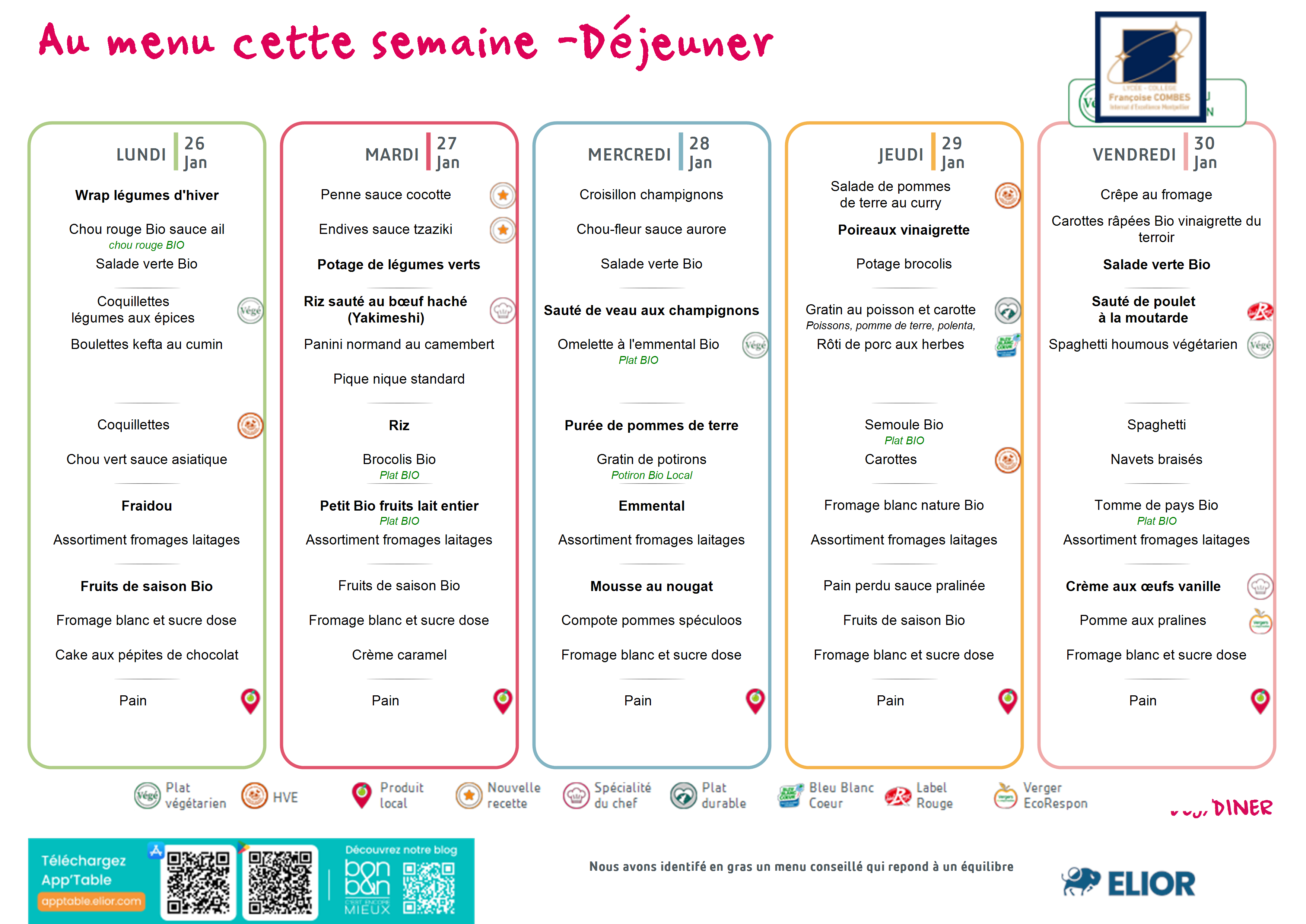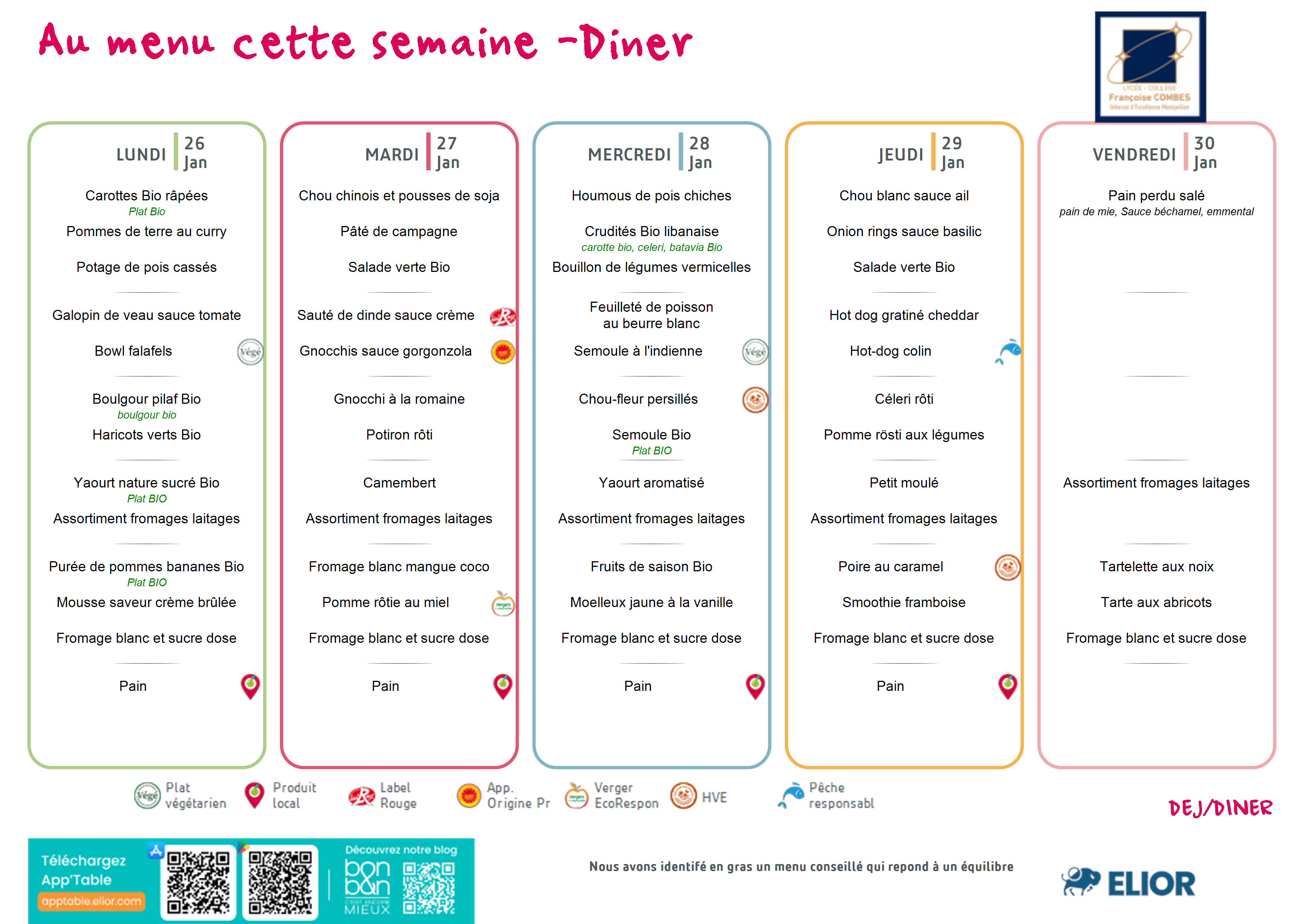 Vous trouverez en pièces jointes le menu du déjeuner d'une part et du dîner d'autre part de la semaine du 26 au 30 janvier 2026. Ce menu est susceptible d'être modifié en fonction de l’approvisionnement.