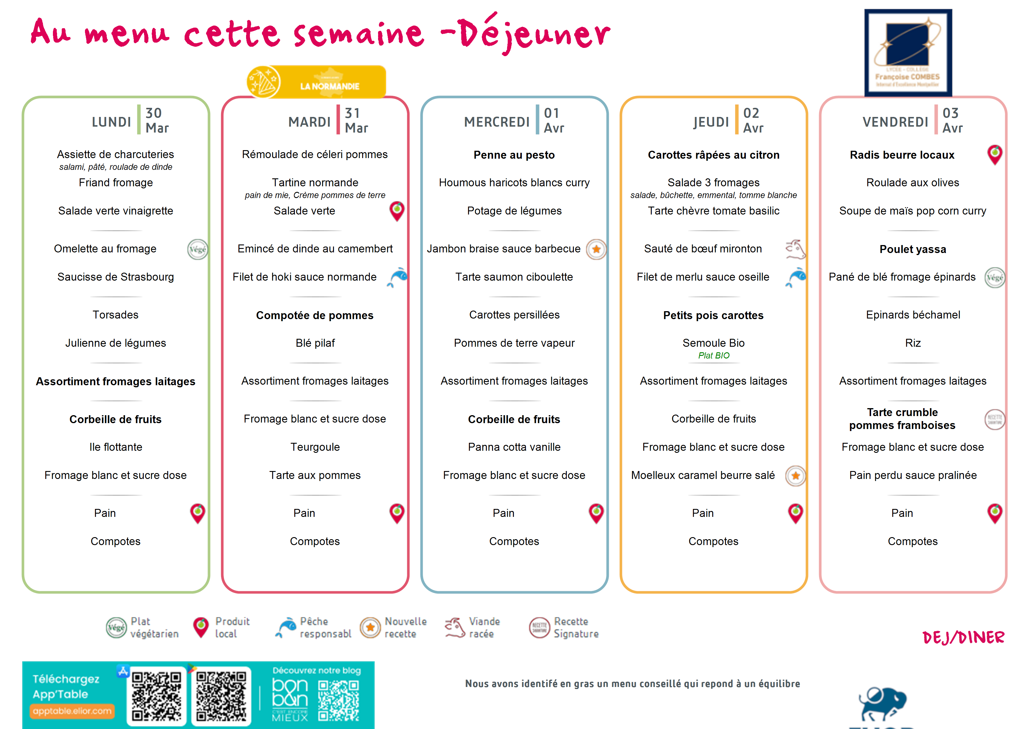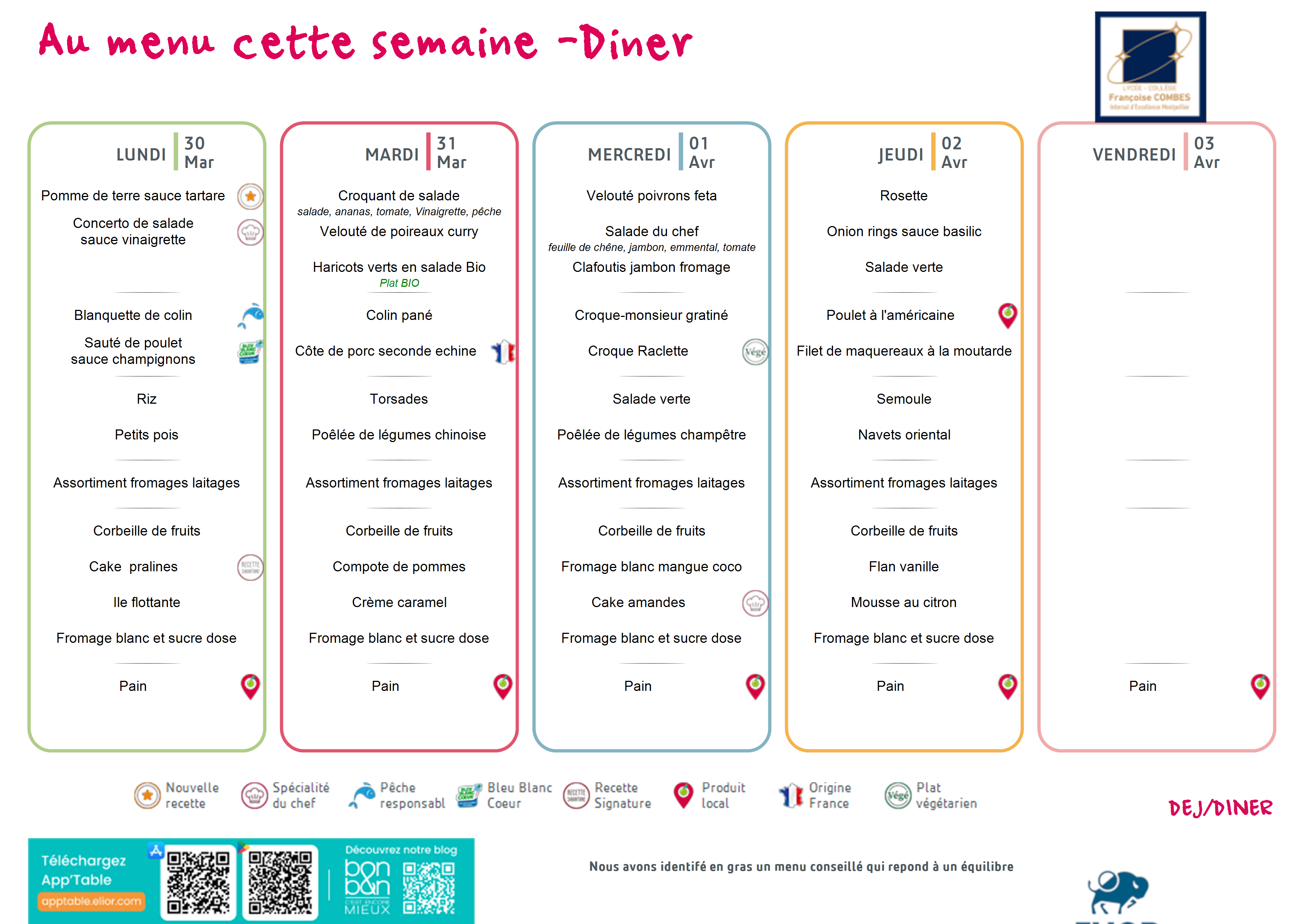 Vous trouverez en pièces jointes le menu du déjeuner d'une part et du dîner d'autre part de la semaine du 30 mars au 3 avril 2026. Ce menu est susceptible d'être modifié en fonction de l’approvisionnement.